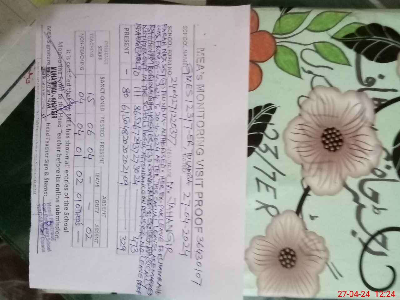 | Attendance Register | Head Teacher | MEA with School | Visit Proof |