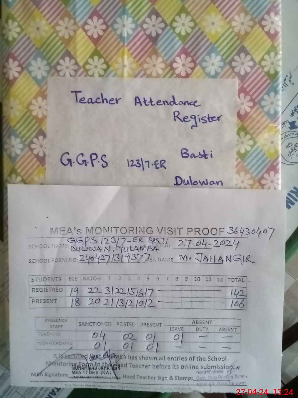 | Attendance Register | Head Teacher | MEA with School | Visit Proof |