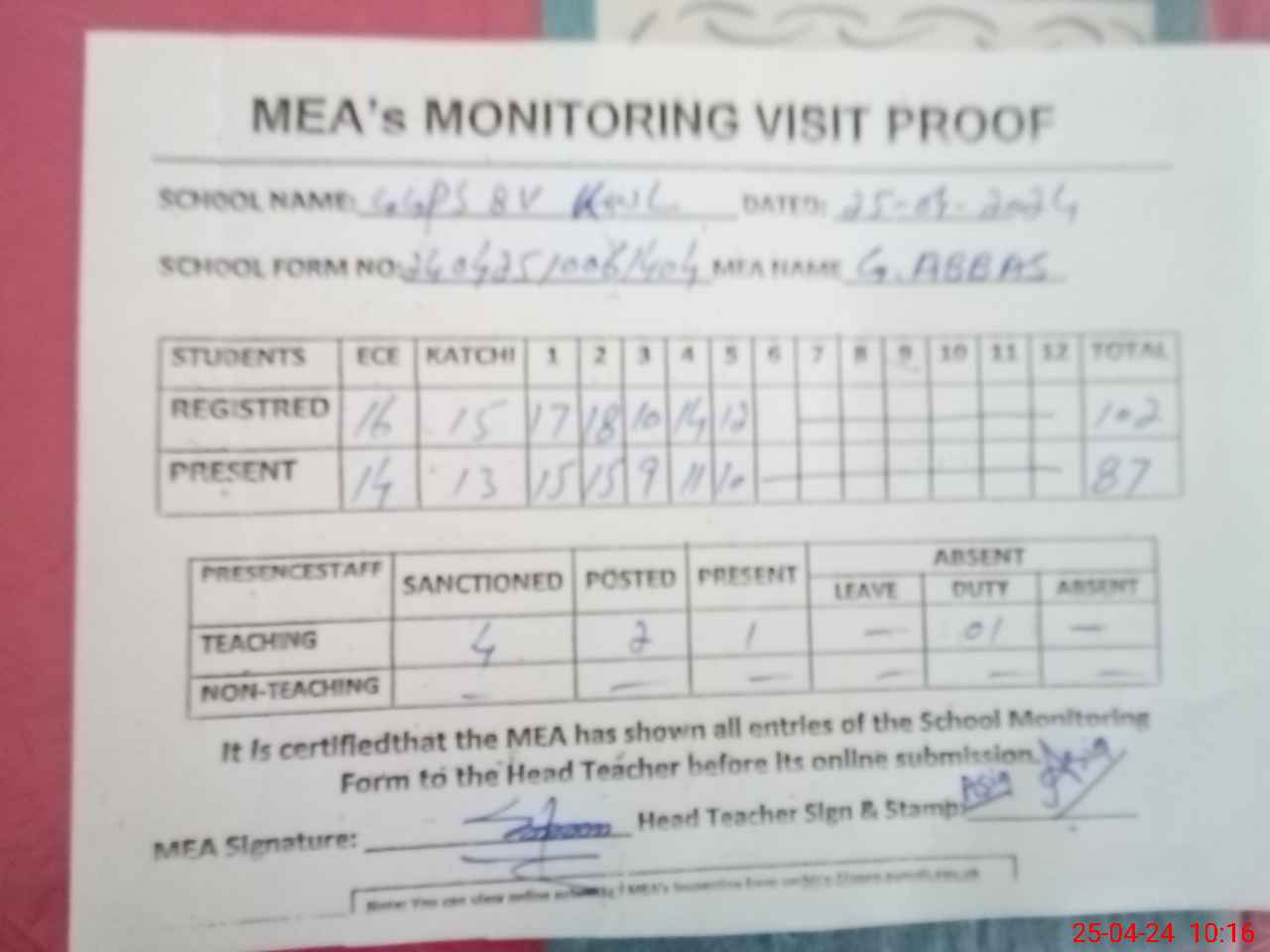 | Attendance Register | Head Teacher | MEA with School | Visit Proof |