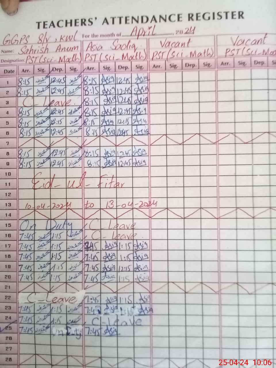 | Leave | Duty | Absent | Maternity | Medical | Ex- Pak |