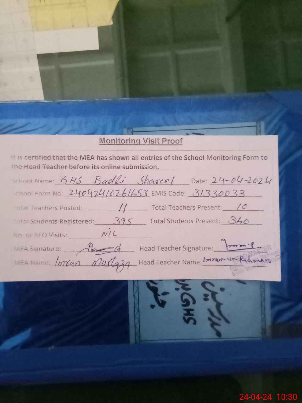 | Attendance Register | Head Teacher | MEA with School | Visit Proof |