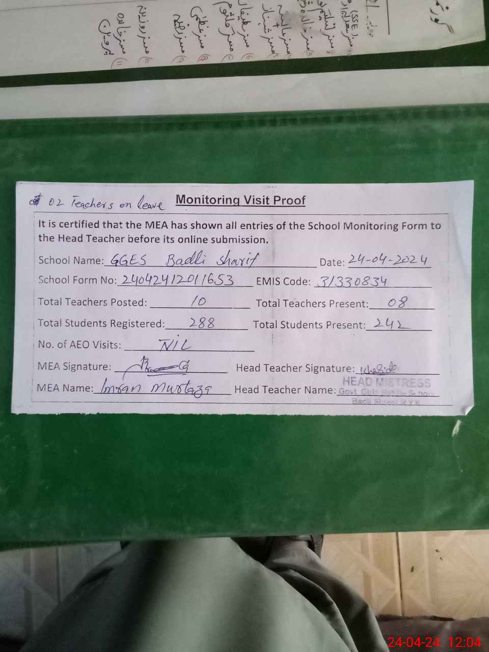 | Attendance Register | Head Teacher | MEA with School | Visit Proof |