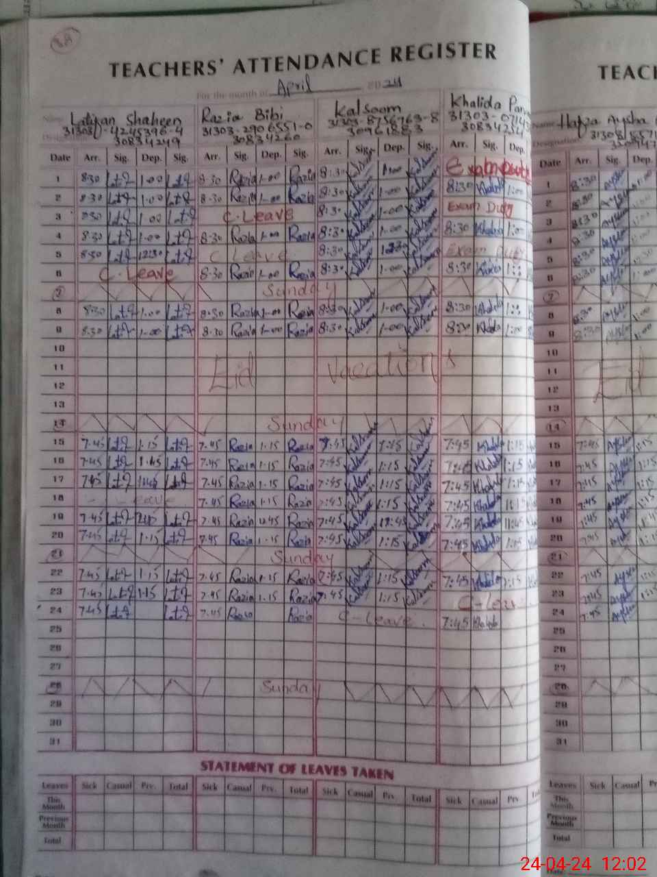 | Leave | Duty | Absent | Maternity | Medical | Ex- Pak |