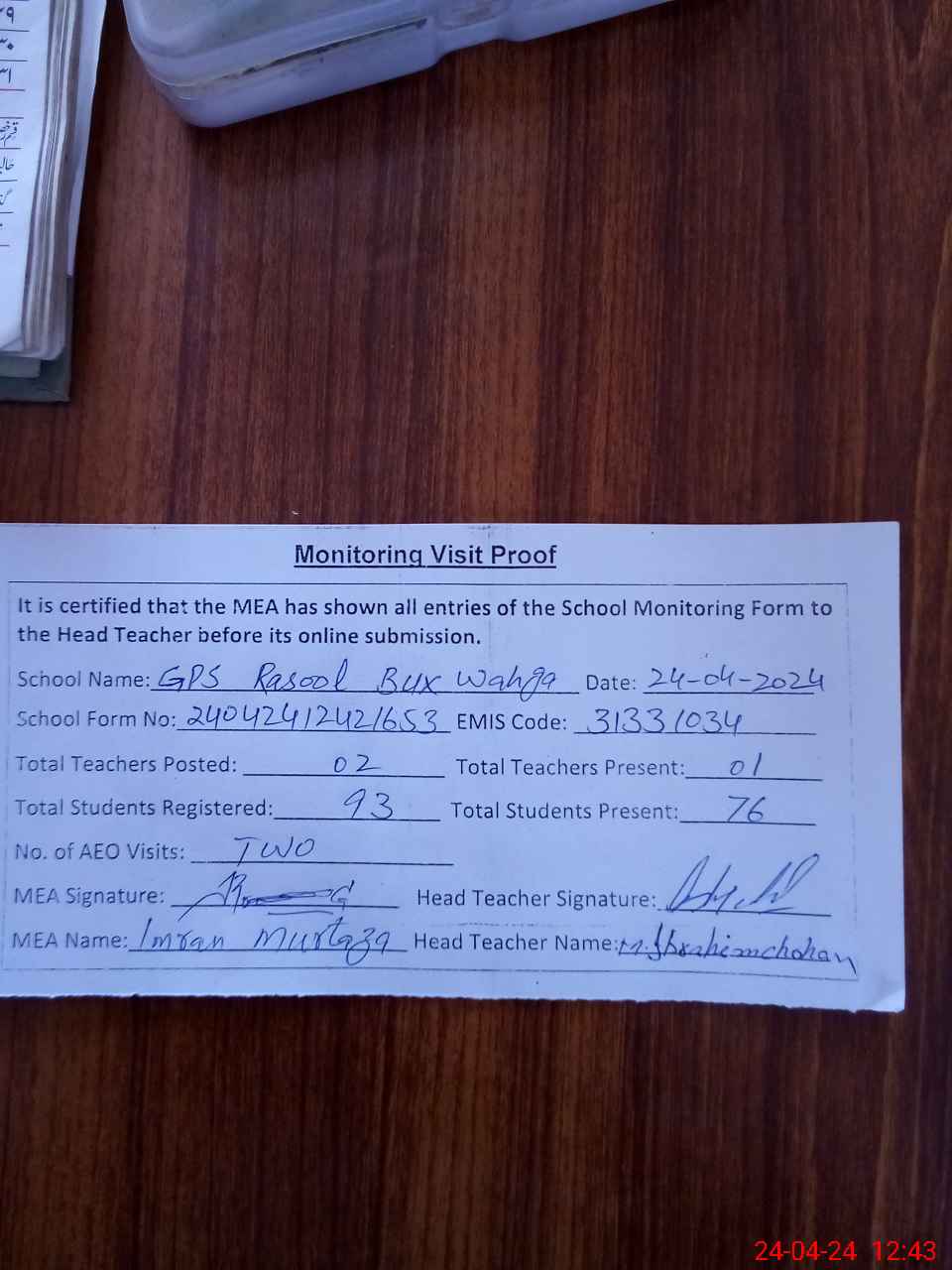 | EMIS Code: 31331034 | Name of School: GPS RASUL BUX WAHGA | |||