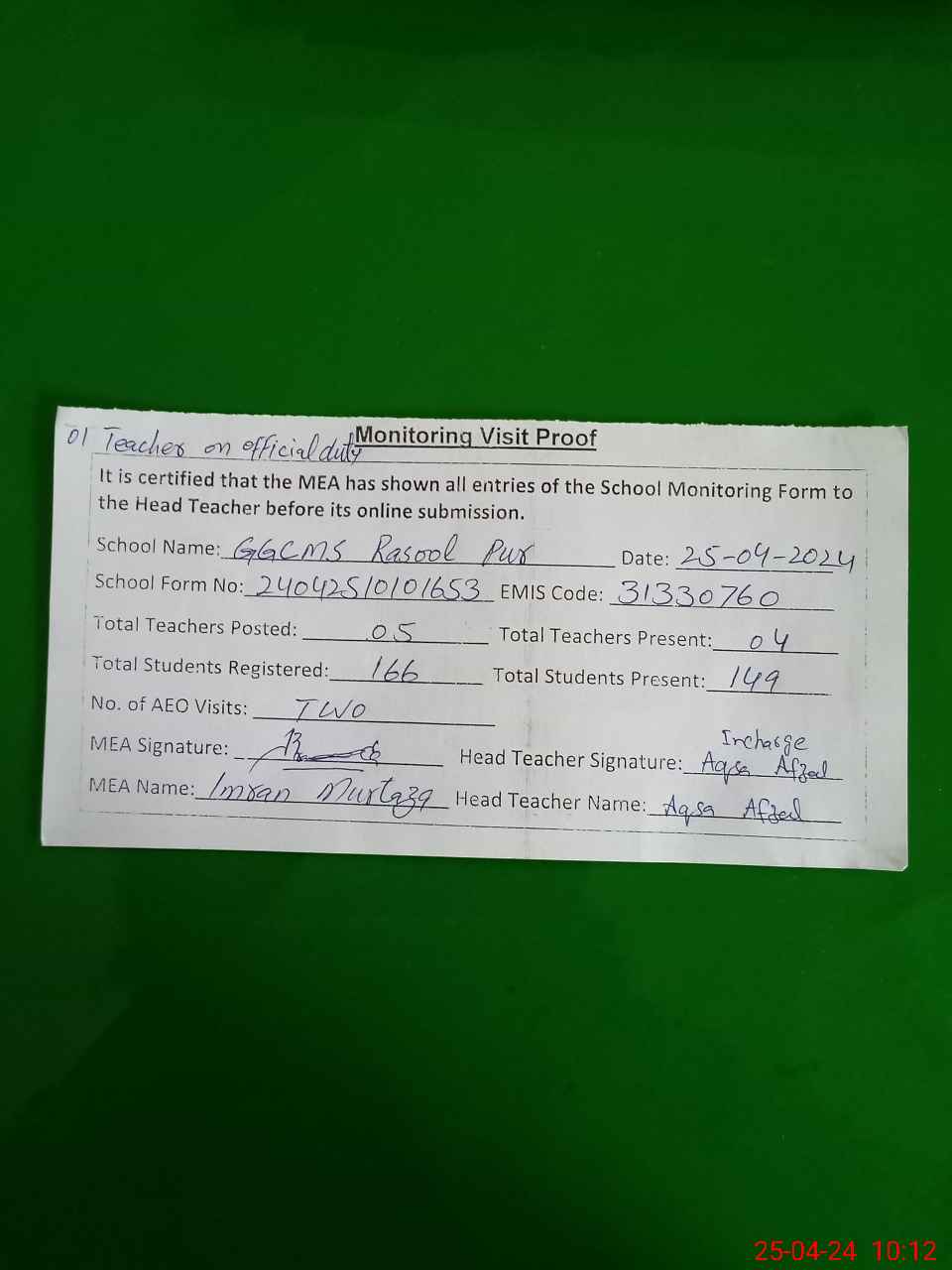 | EMIS Code: 31330760 | Name of School: GGCMS RASOOL PUR | |||