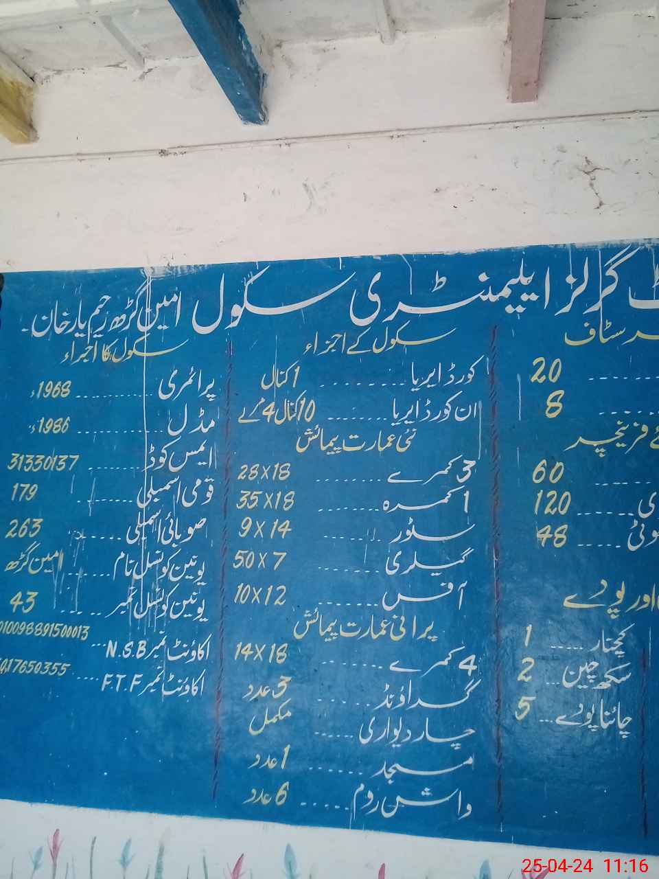 | District: RAHIMYAR KHAN | Tehsil: RAHIMYAR KHAN | Markaz: AMIN GARH - FEMALE | Level: Middle | |