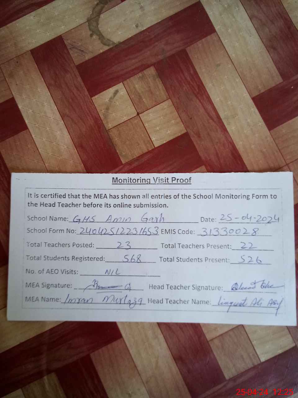 | Attendance Register | Head Teacher | MEA with School | Visit Proof |