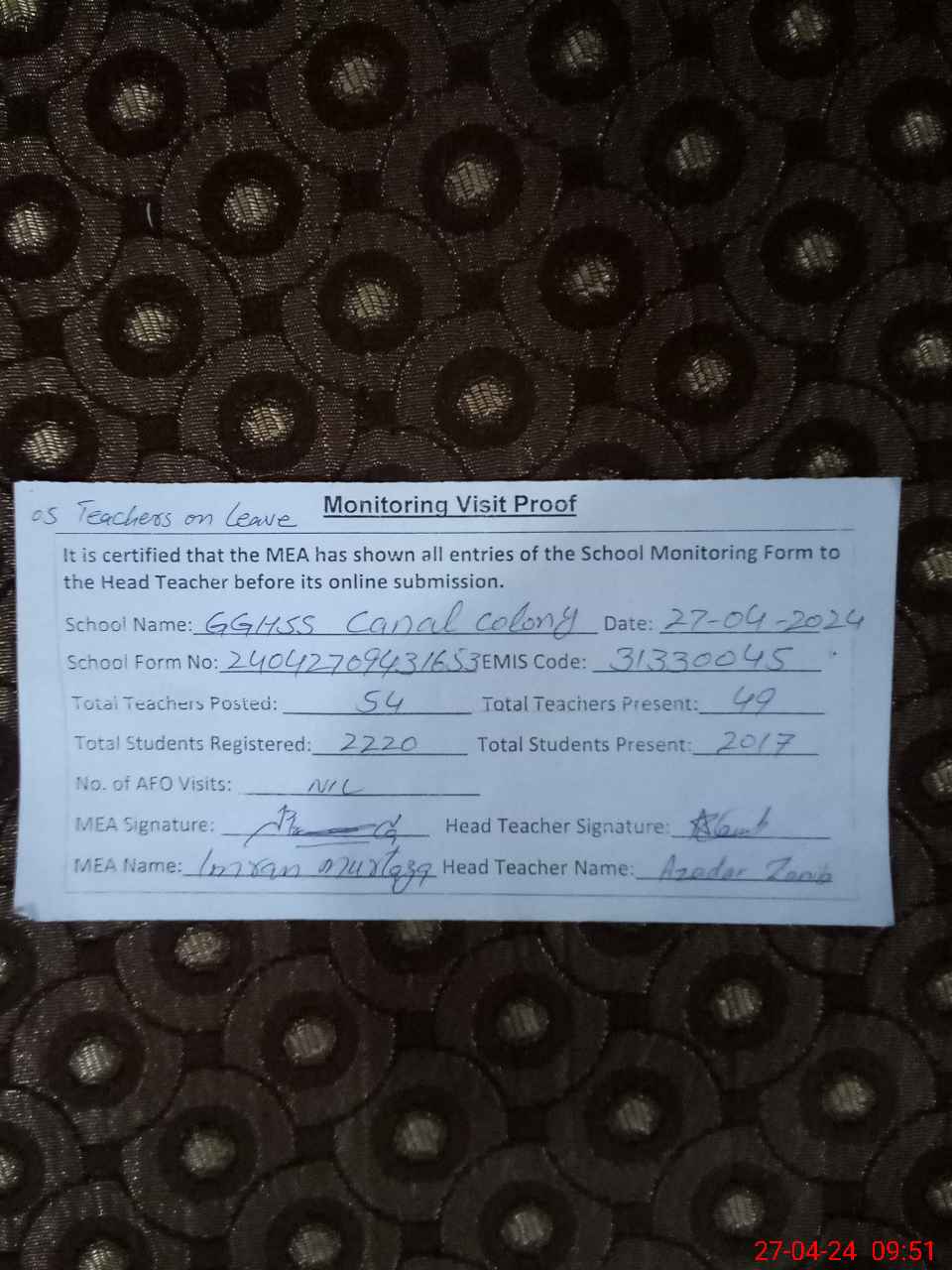 | Attendance Register | Head Teacher | MEA with School | Visit Proof |