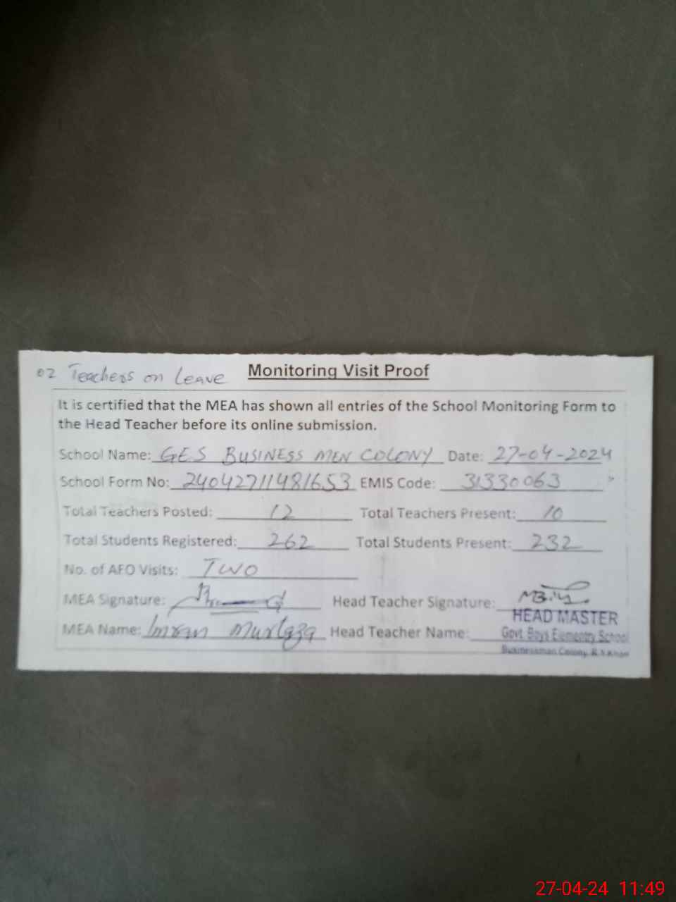| Attendance Register | Head Teacher | MEA with School | Visit Proof |