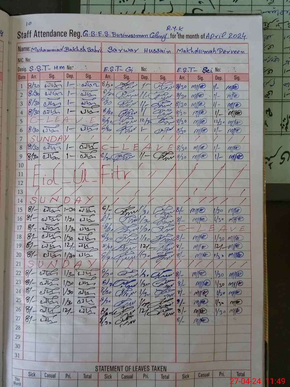 | CNIC | Full Name | Designation | R/C | Absence During Last Calender Month |