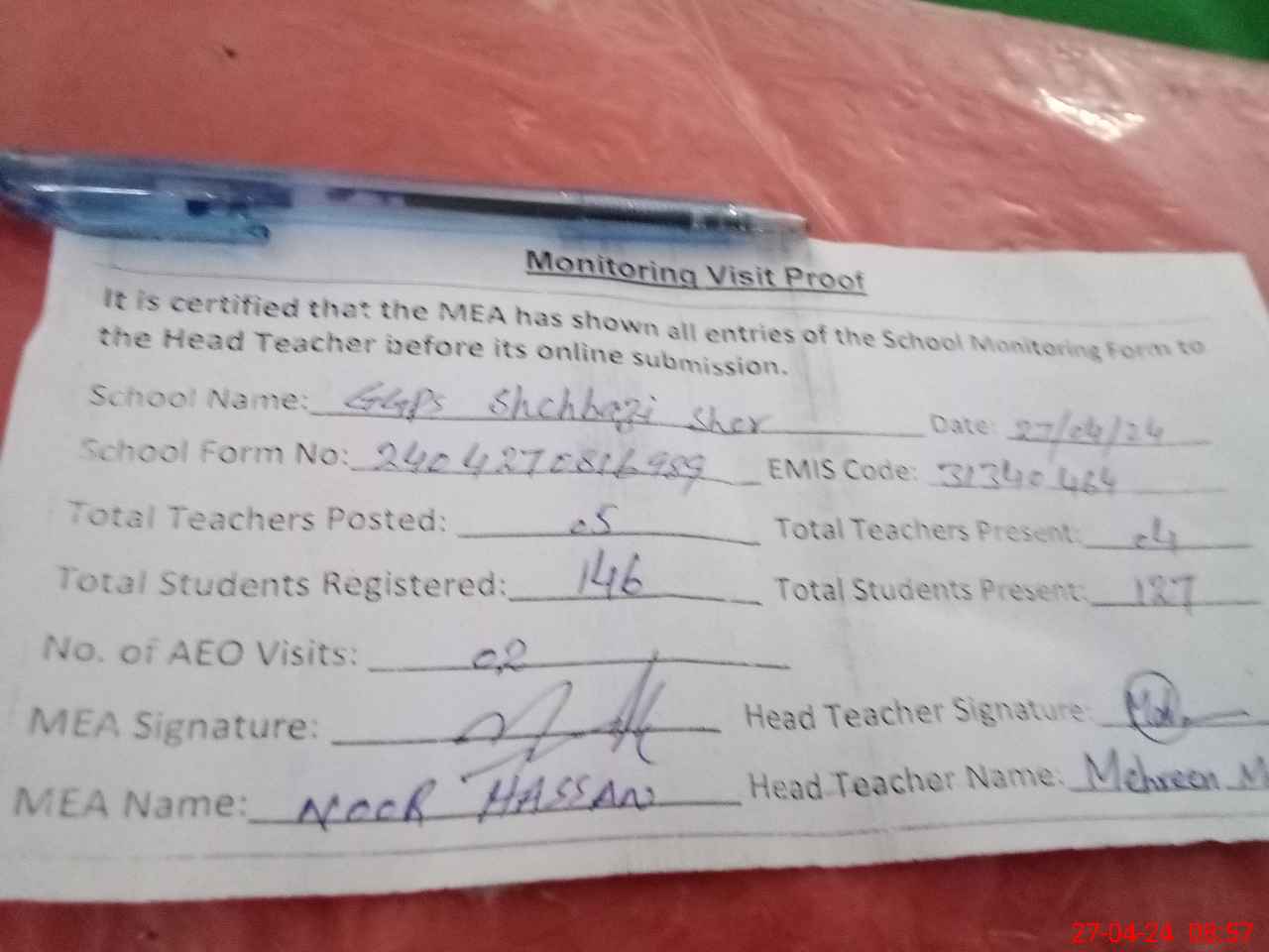 | Attendance Register | Head Teacher | MEA with School | Visit Proof |