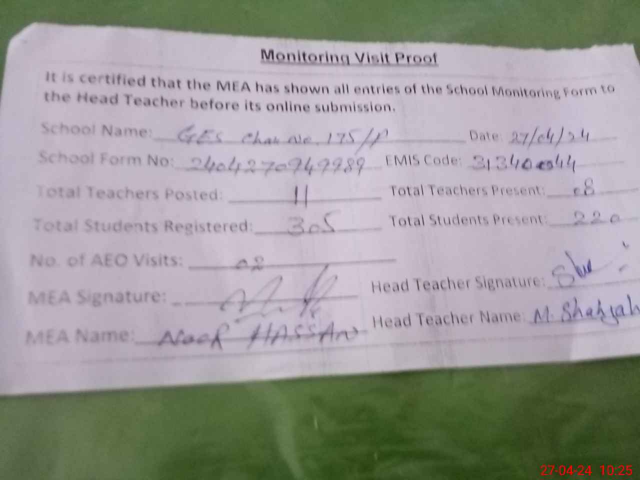 | Attendance Register | Head Teacher | MEA with School | Visit Proof |