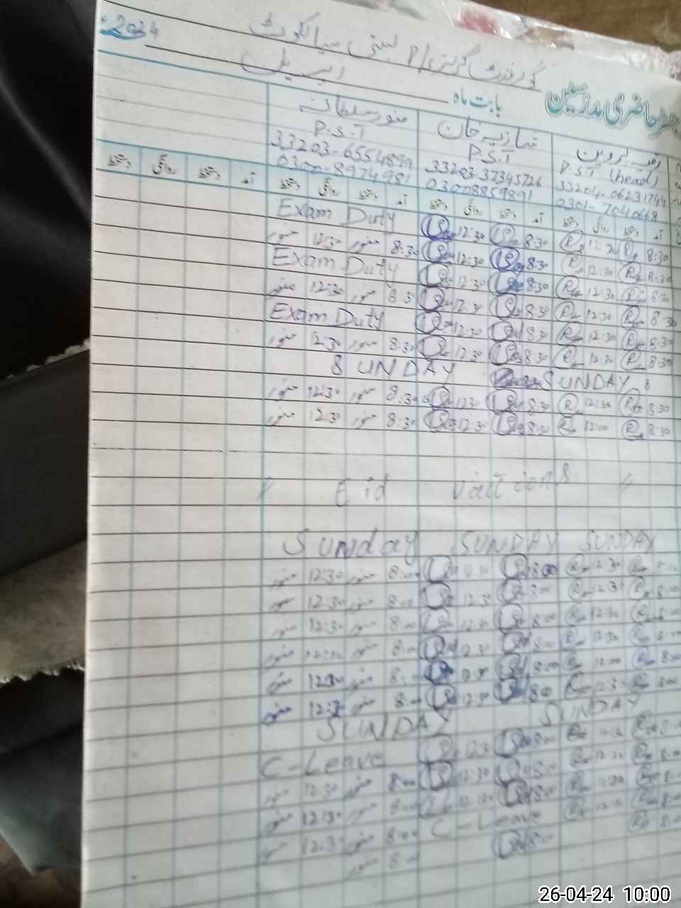 | Leave | Duty | Absent | Maternity | Medical | Ex- Pak |