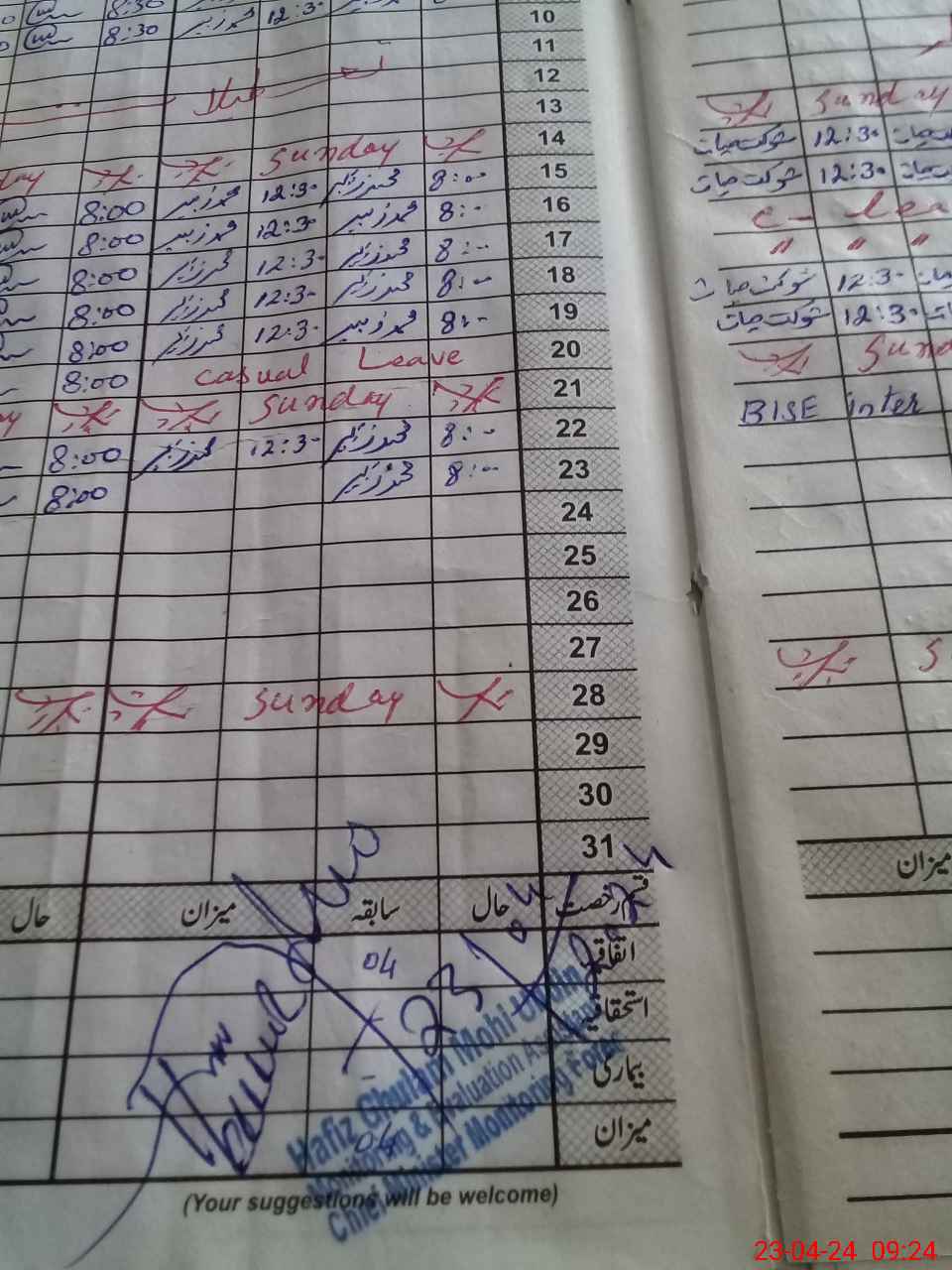 | CNIC | Full Name | Designation | R/C | Absence During Last Calender Month |