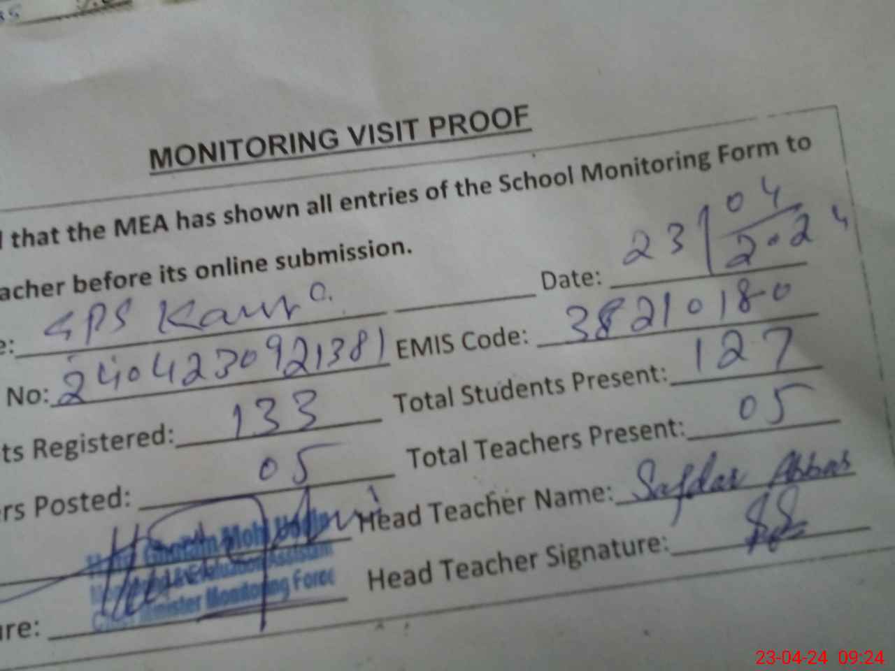| Attendance Register | Head Teacher | MEA with School | Visit Proof |