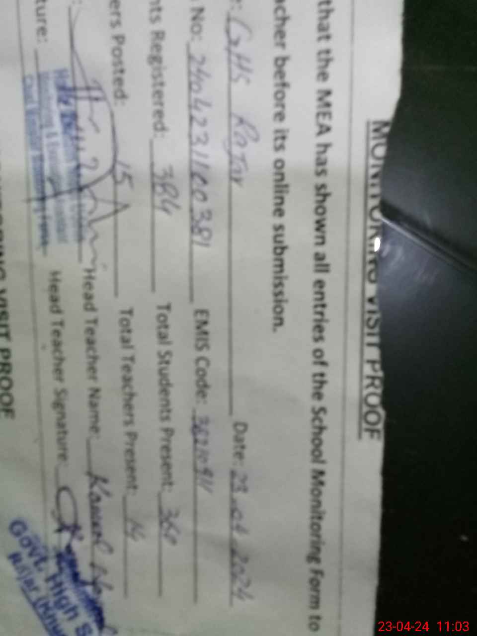 | Attendance Register | Head Teacher | MEA with School | Visit Proof |