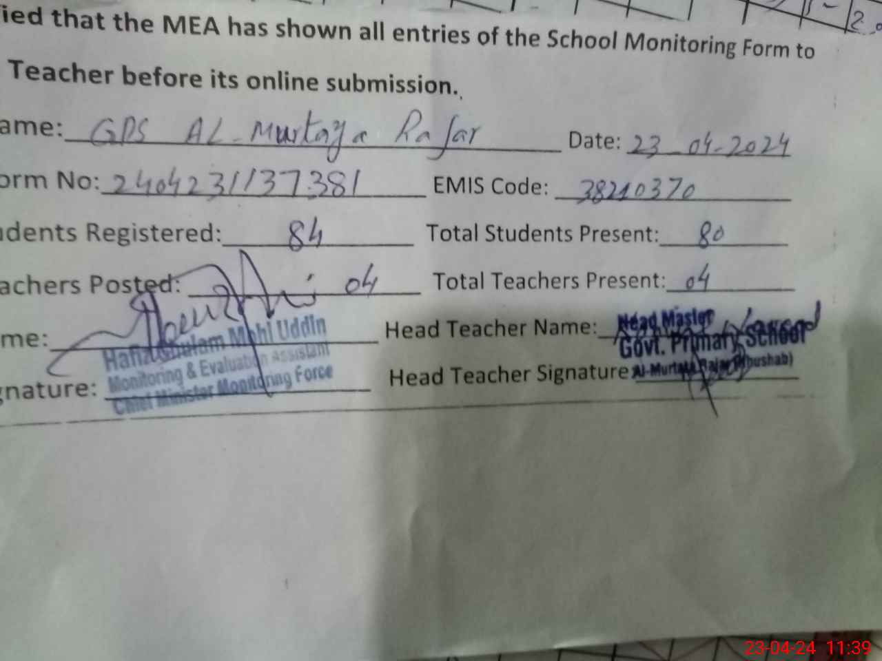 | Attendance Register | Head Teacher | MEA with School | Visit Proof |