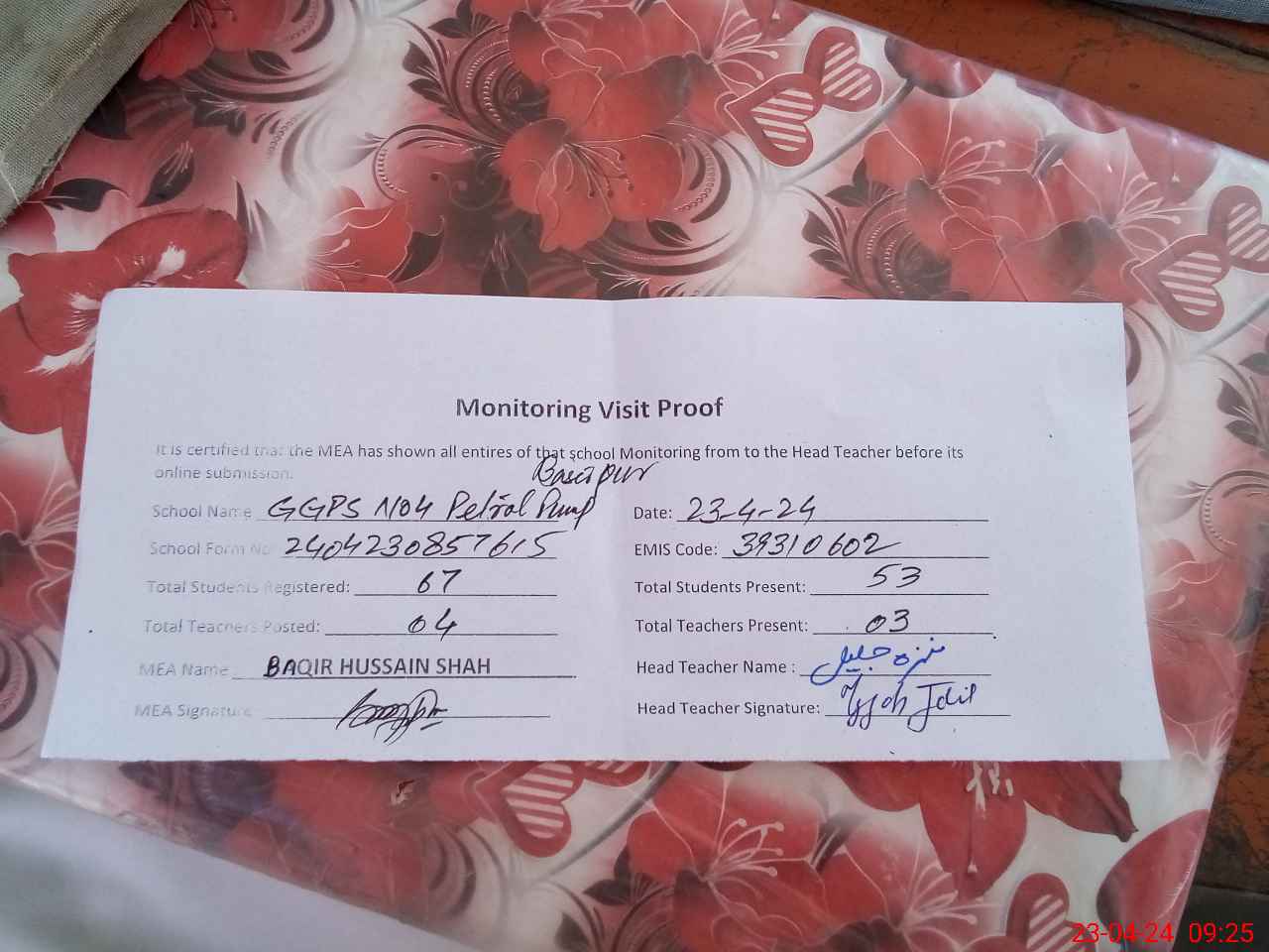 | Attendance Register | Head Teacher | MEA with School | Visit Proof |