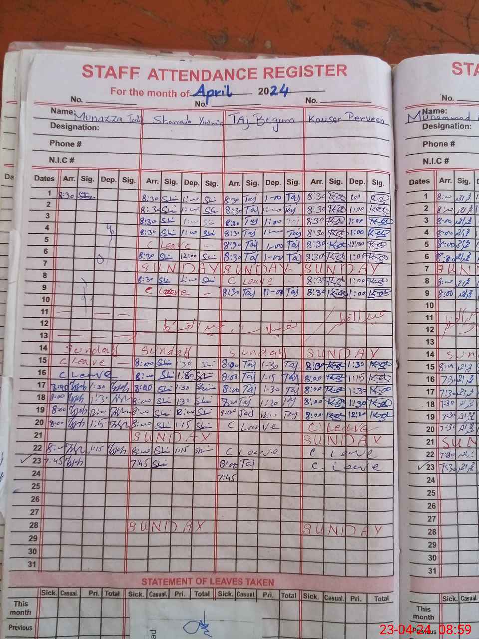 | CNIC | Full Name | Designation | R/C | Absence During Last Calender Month |