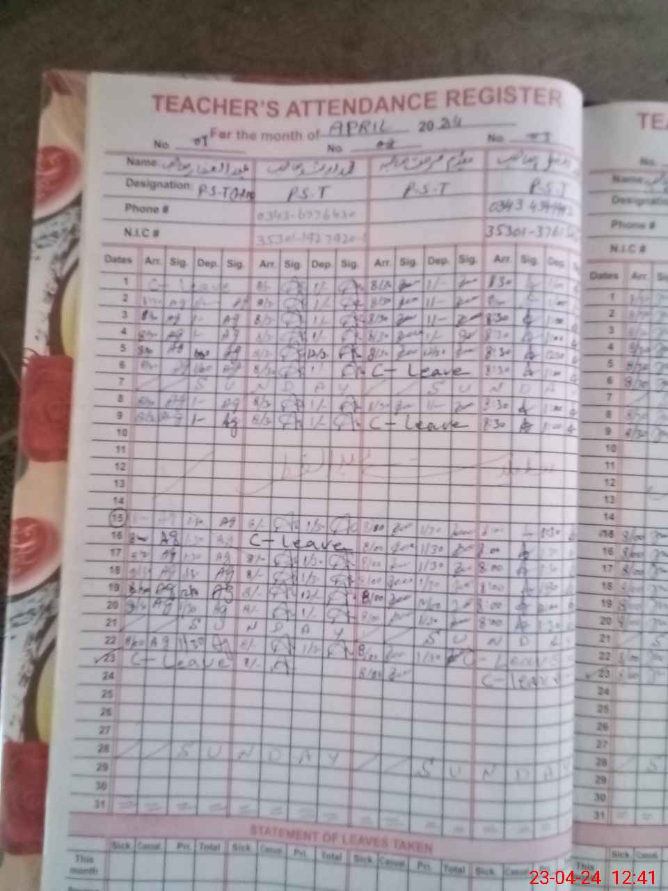 | CNIC | Full Name | Designation | R/C | Absence During Last Calender Month |