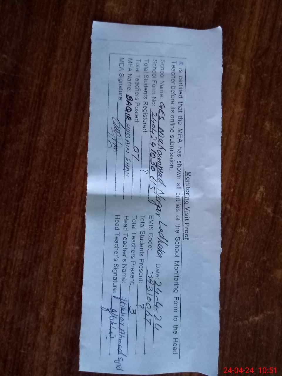 | Certified that this School was Inspected by the Undersigned MEA/DMO Today and the Information Stated Above is as Per Record. | |||||