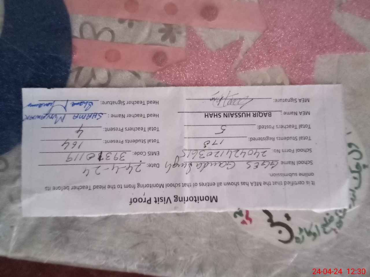 | Certified that this School was Inspected by the Undersigned MEA/DMO Today and the Information Stated Above is as Per Record. | |||||