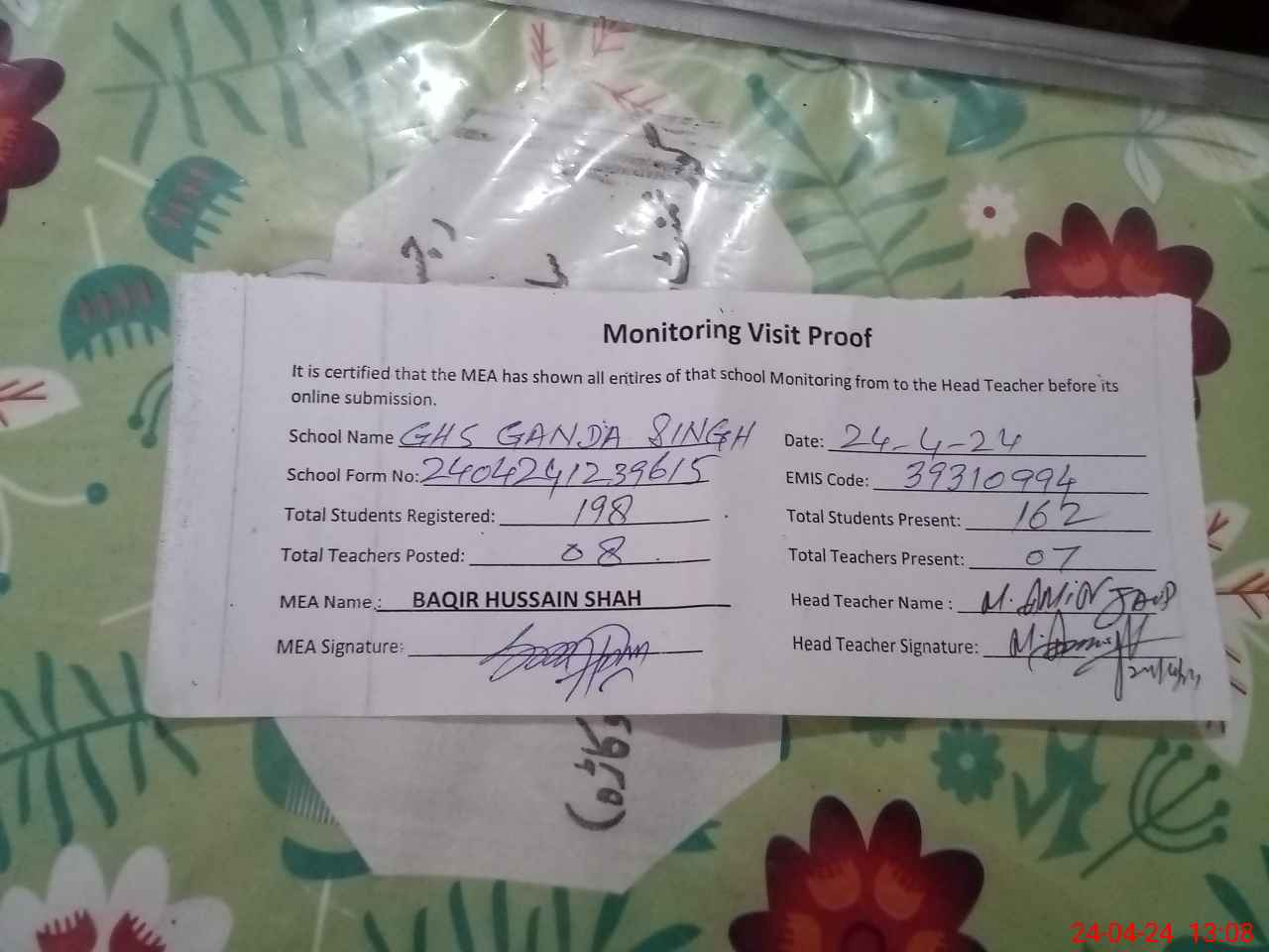 | Attendance Register | Head Teacher | MEA with School | Visit Proof |