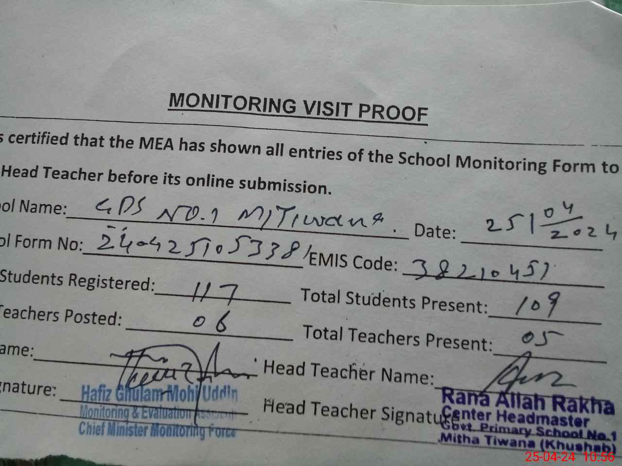 | EMIS Code: 38210451 | Name of School: GPS NO. 1 MITHA TIWANA | |||