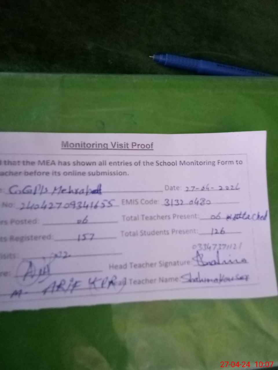 | Attendance Register | Head Teacher | MEA with School | Visit Proof |