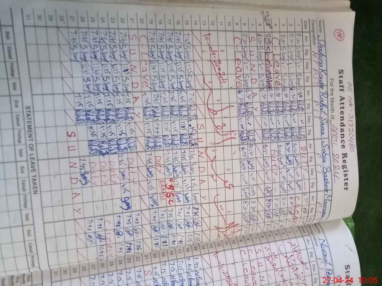 | Leave | Duty | Absent | Maternity | Medical | Ex- Pak |