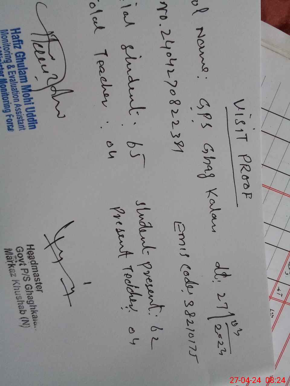 | Attendance Register | Head Teacher | MEA with School | Visit Proof |