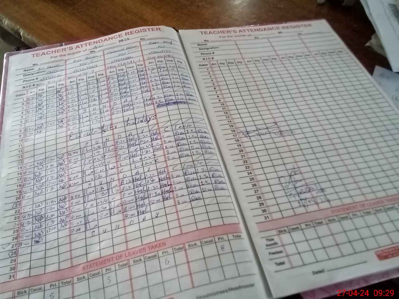 | CNIC | Full Name | Designation | R/C | Absence During Last Calender Month |