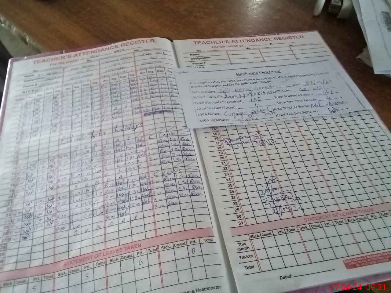 | Attendance Register | Head Teacher | MEA with School | Visit Proof |