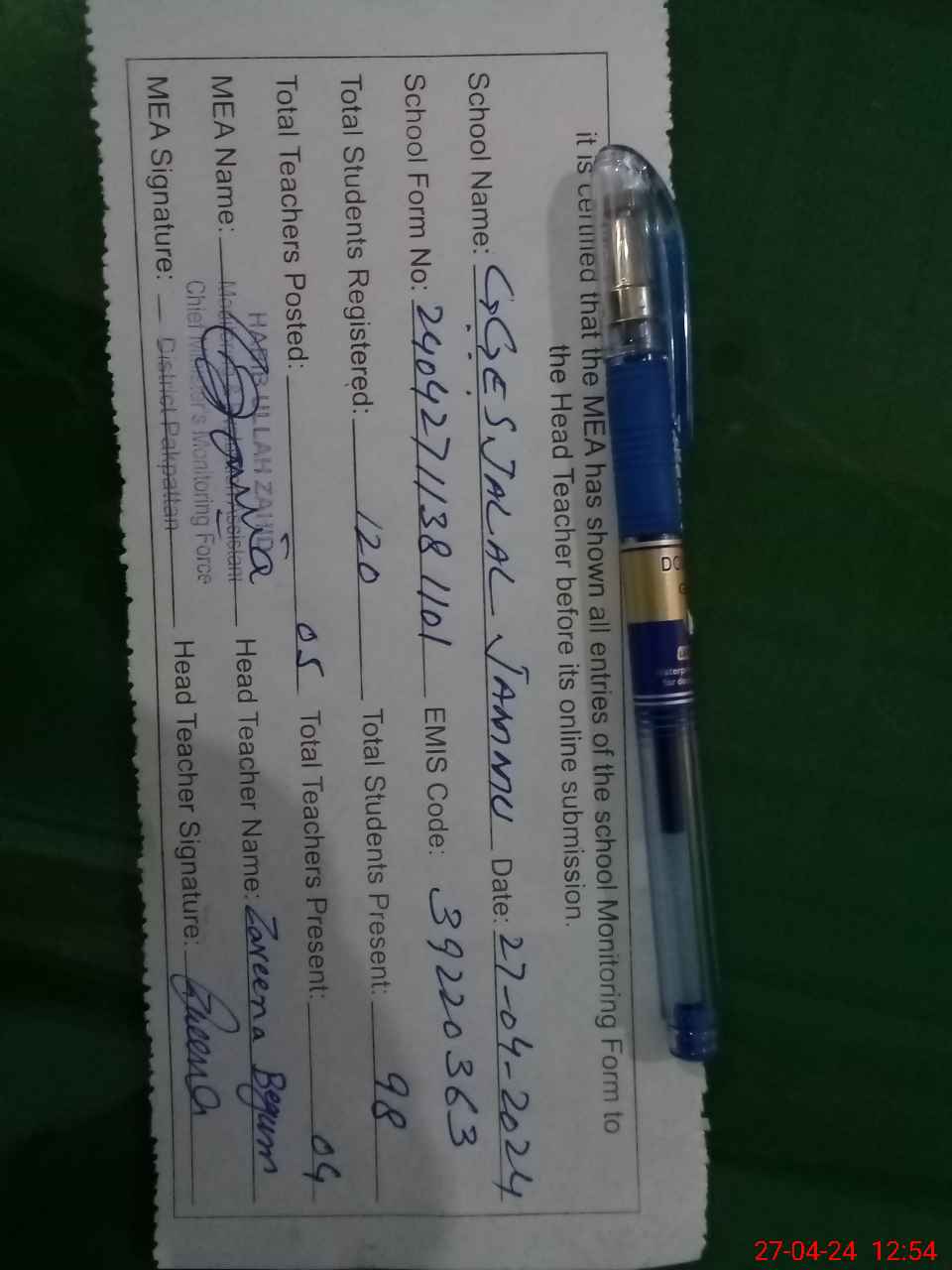 | Name: ZA**** BE**** Designation: (School Headmaster's/Headmistress's) EST Phone/Cell Number: 03**** |