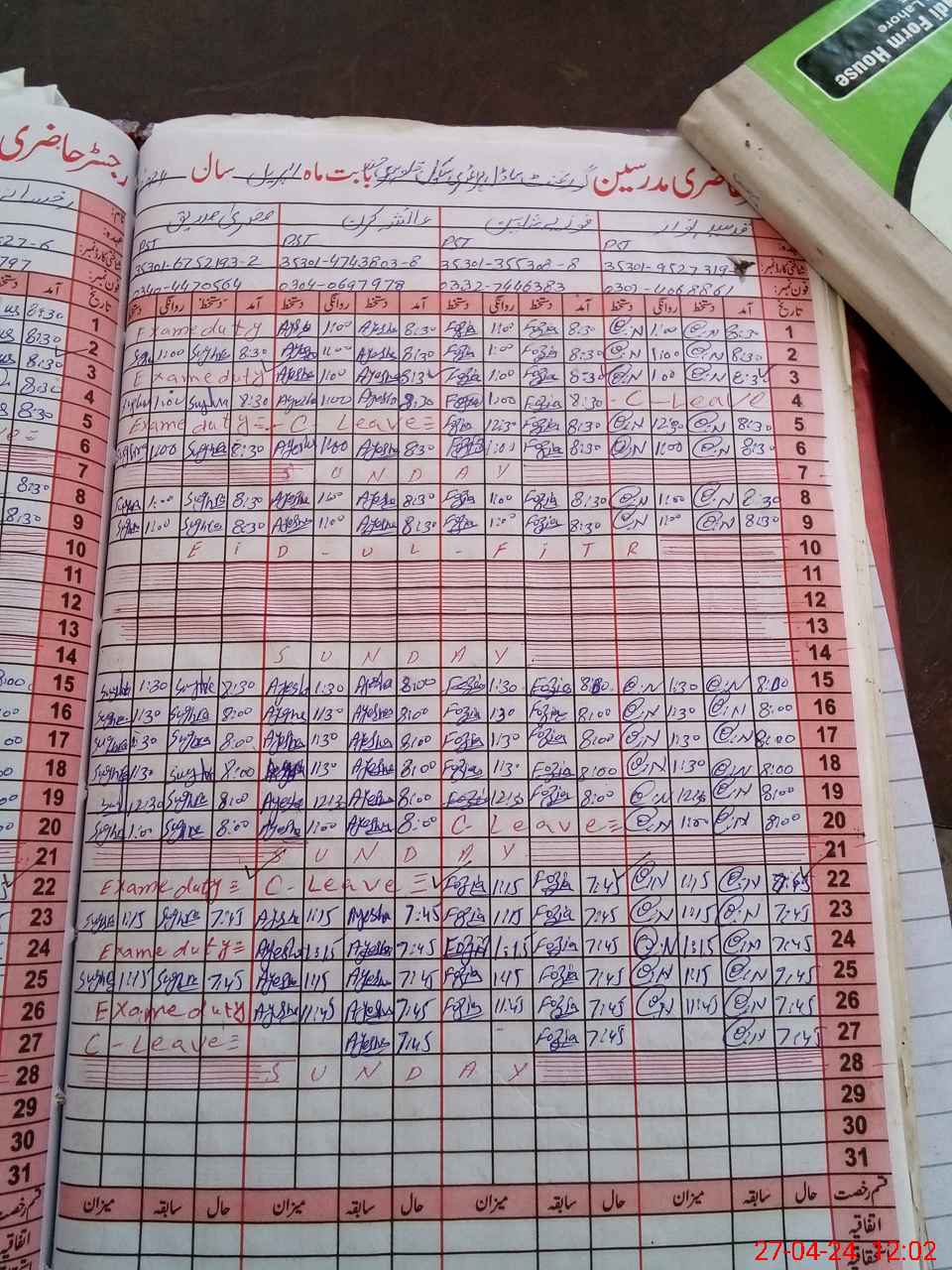 | CNIC | Full Name | Designation | R/C | Absence During Last Calender Month |