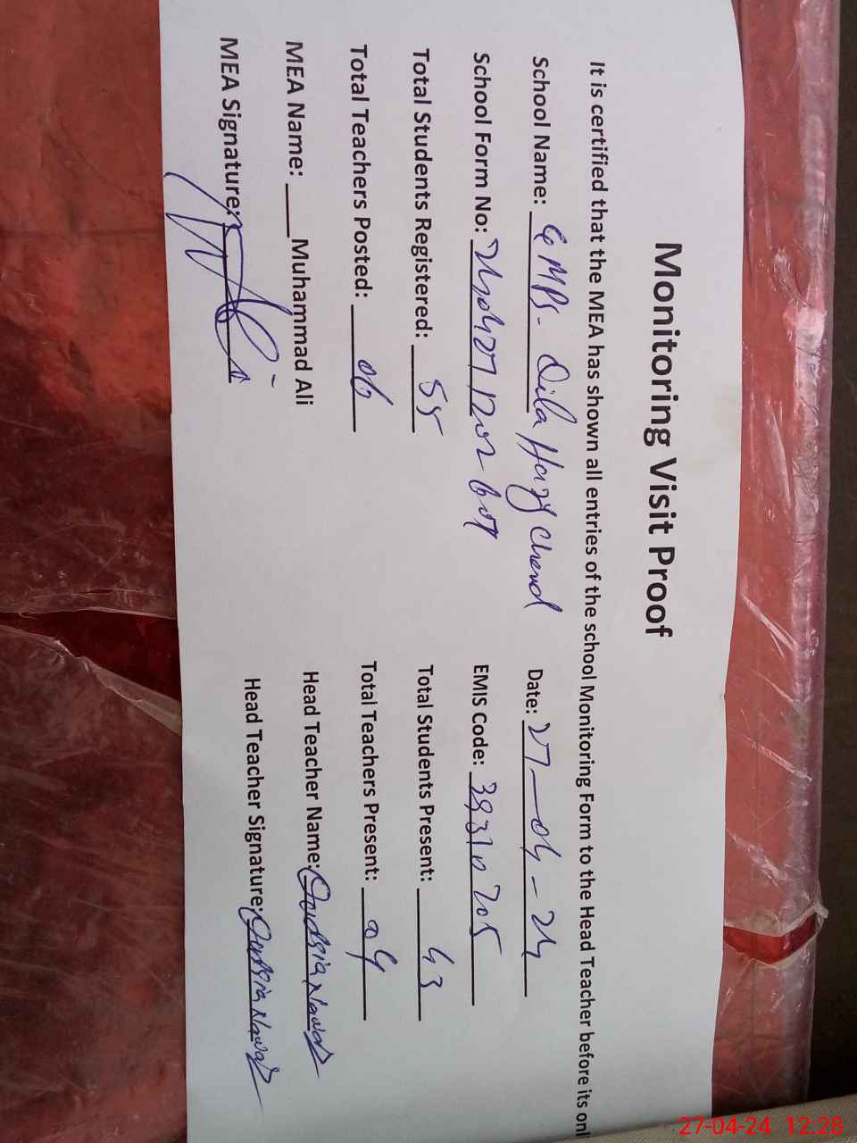 | Attendance Register | Head Teacher | MEA with School | Visit Proof |