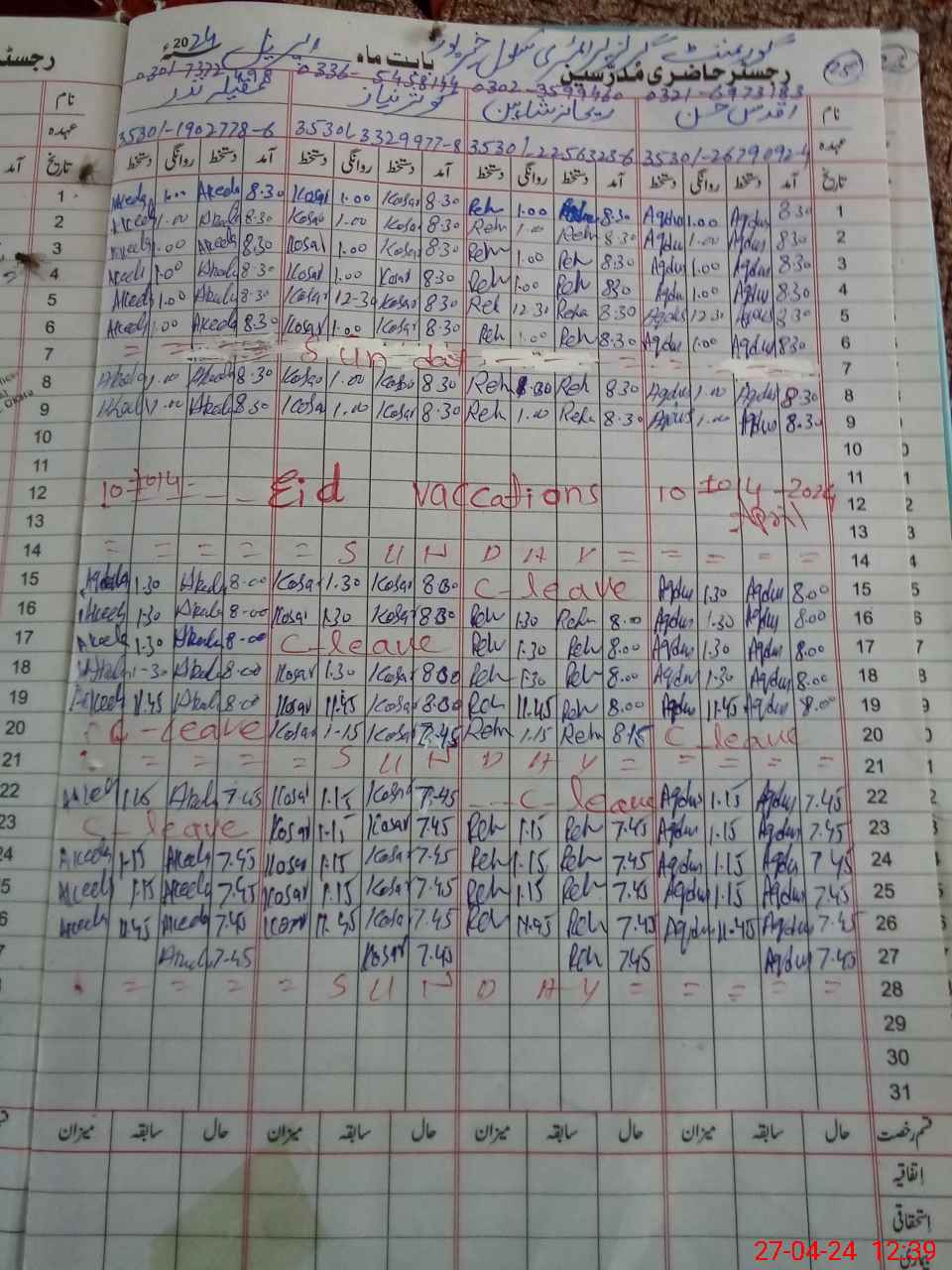 | CNIC | Full Name | Designation | R/C | Absence During Last Calender Month |