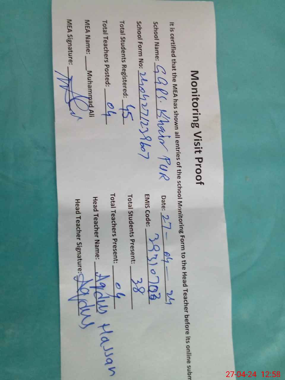 | Attendance Register | Head Teacher | MEA with School | Visit Proof |