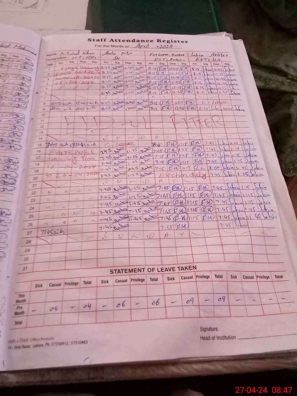 | Leave | Duty | Absent | Maternity | Medical | Ex- Pak |
