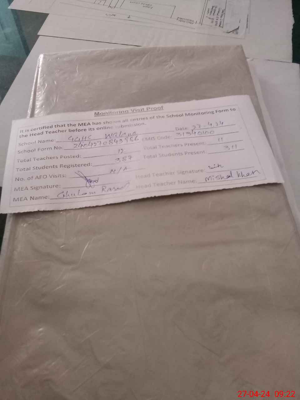 | Attendance Register | Head Teacher | MEA with School | Visit Proof |
