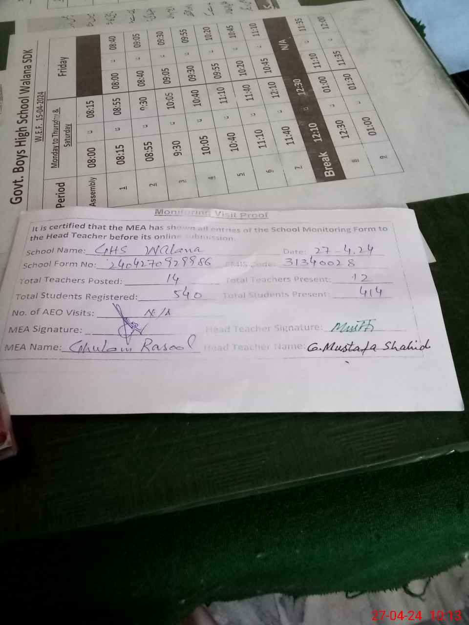 | Attendance Register | Head Teacher | MEA with School | Visit Proof |