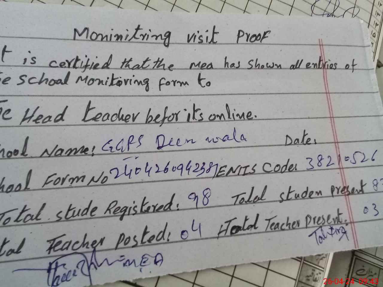 | EMIS Code: 38210526 | Name of School: GGPS DEEN WALA | |||
