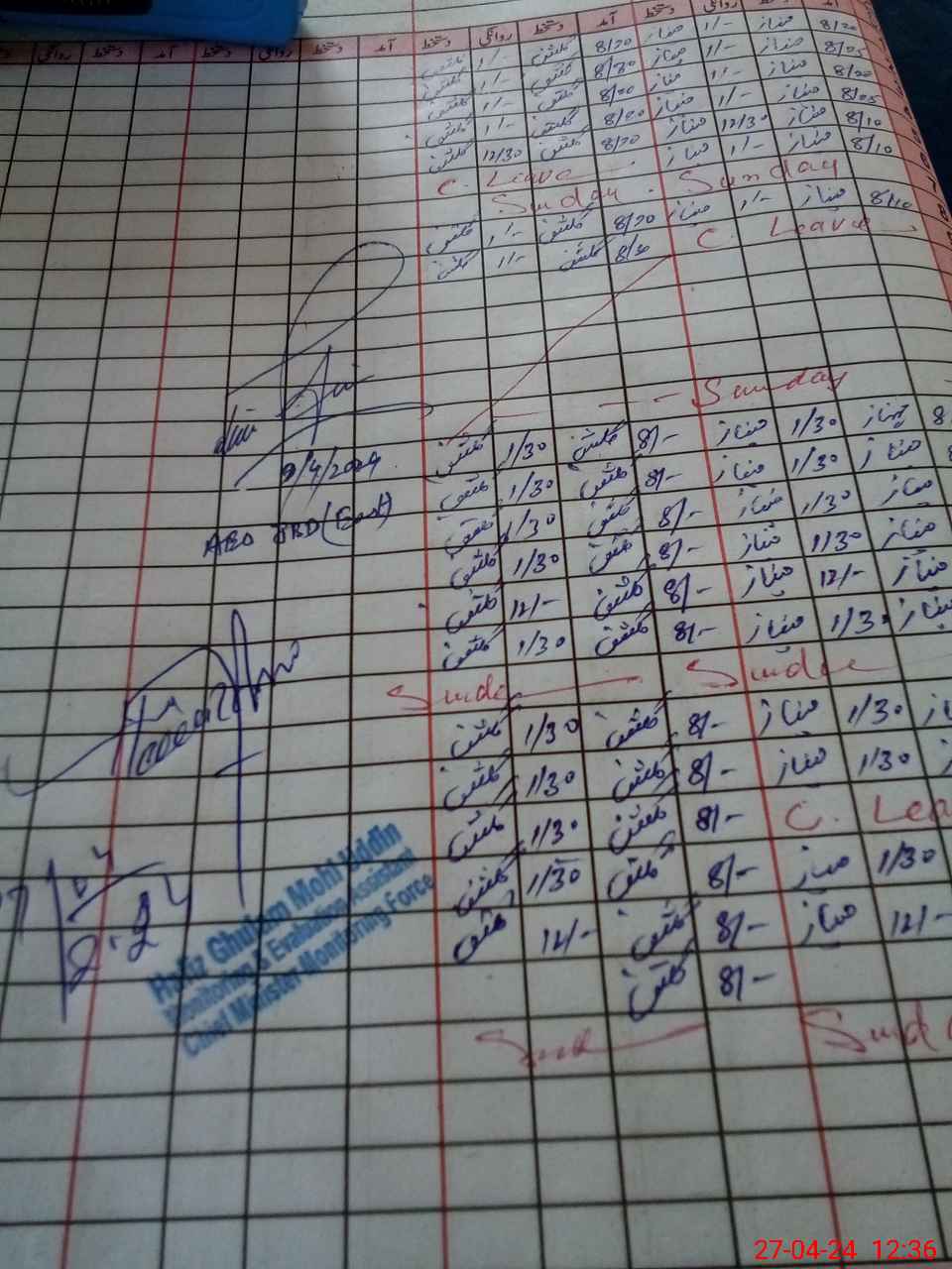 | CNIC | Full Name | Designation | R/C | Absence During Last Calender Month |