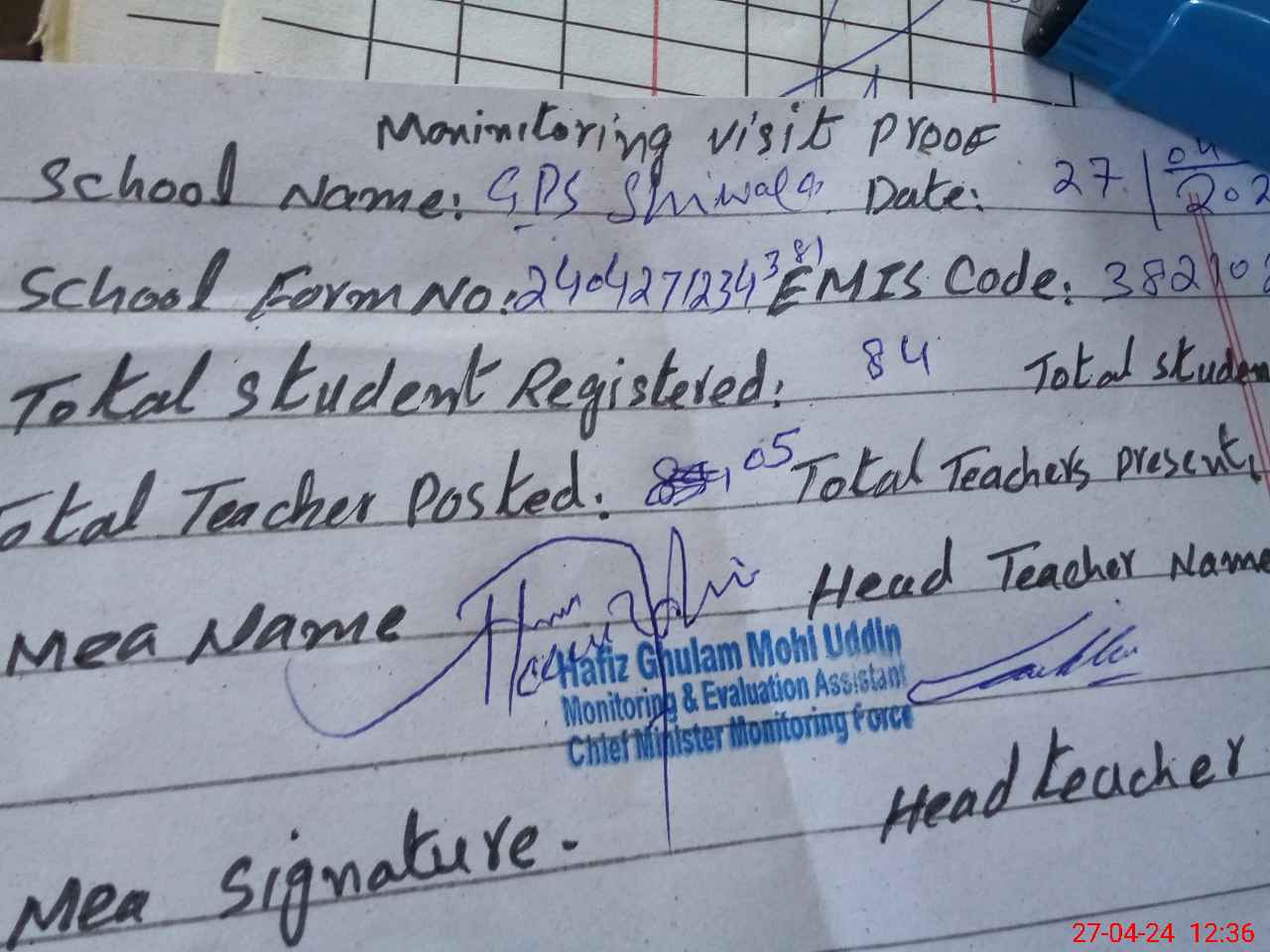 | Name: In**** Az**** Ak**** Designation: (School Headmaster's/Headmistress's) PST Phone/Cell Number: 03**** |