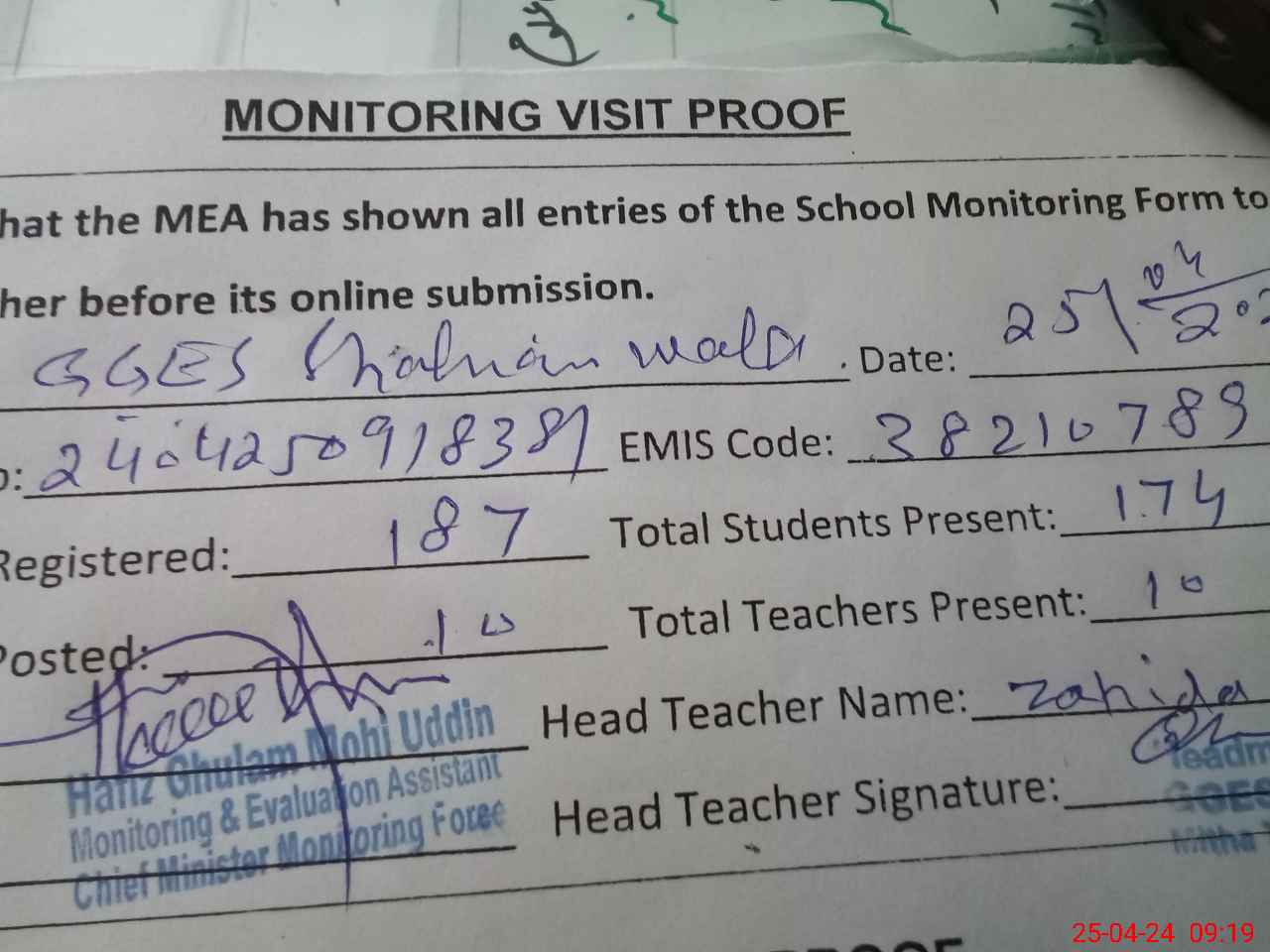 | EMIS Code: 38210789 | Name of School: GGES SHAHIAN WALA | |||