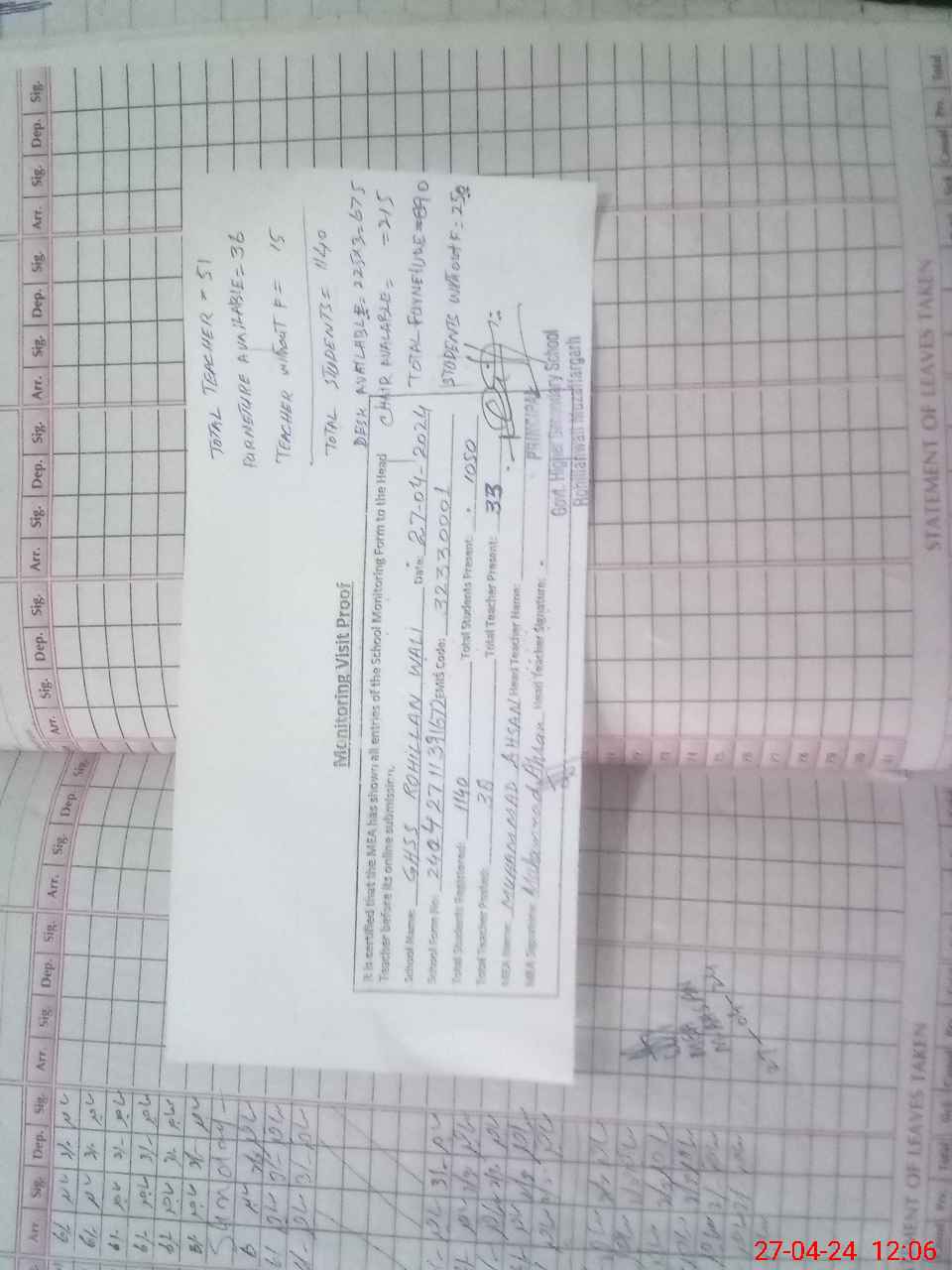 | Attendance Register | Head Teacher | MEA with School | Visit Proof |
