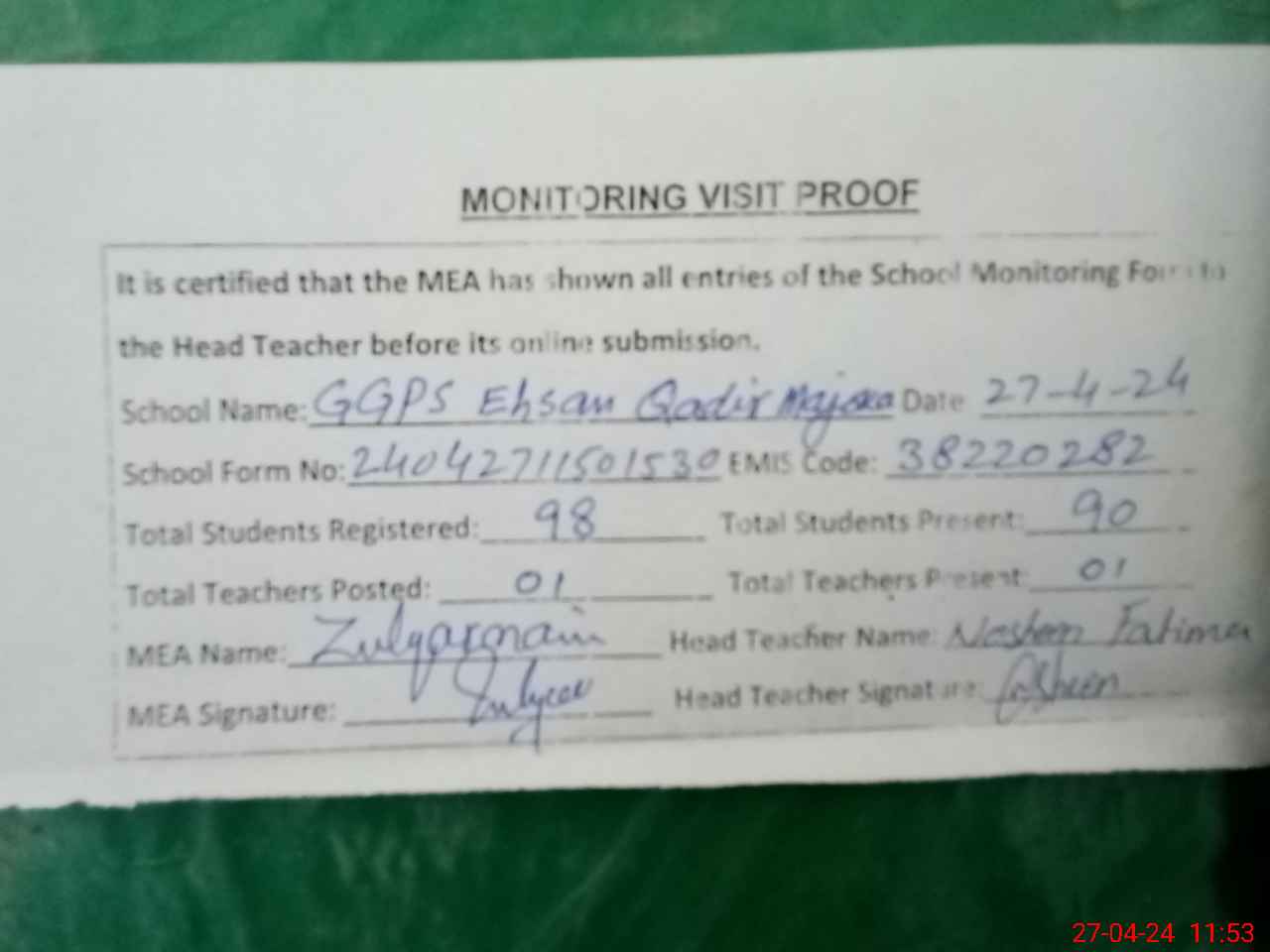 | EMIS Code: 38220282 | Name of School: GGPS EHSAN QADAR MAJOKA | |||