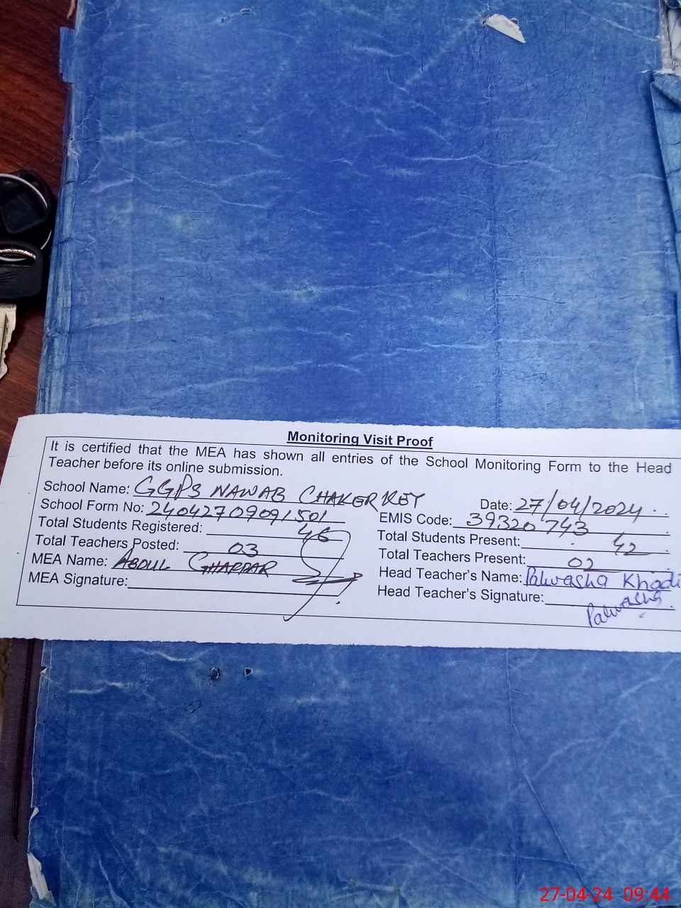 | Attendance Register | Head Teacher | MEA with School | Visit Proof |