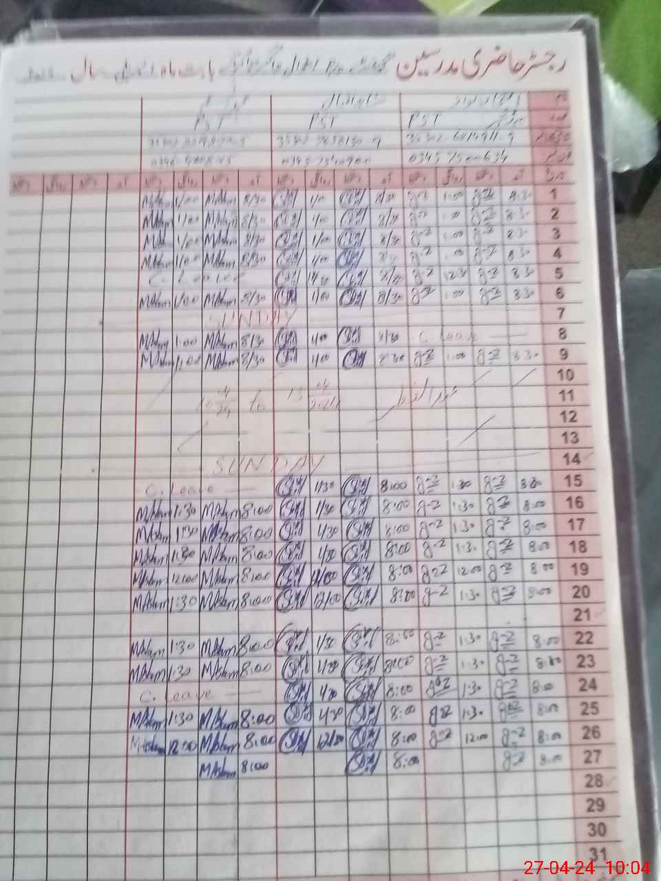 | CNIC | Full Name | Designation | R/C | Absence During Last Calender Month |