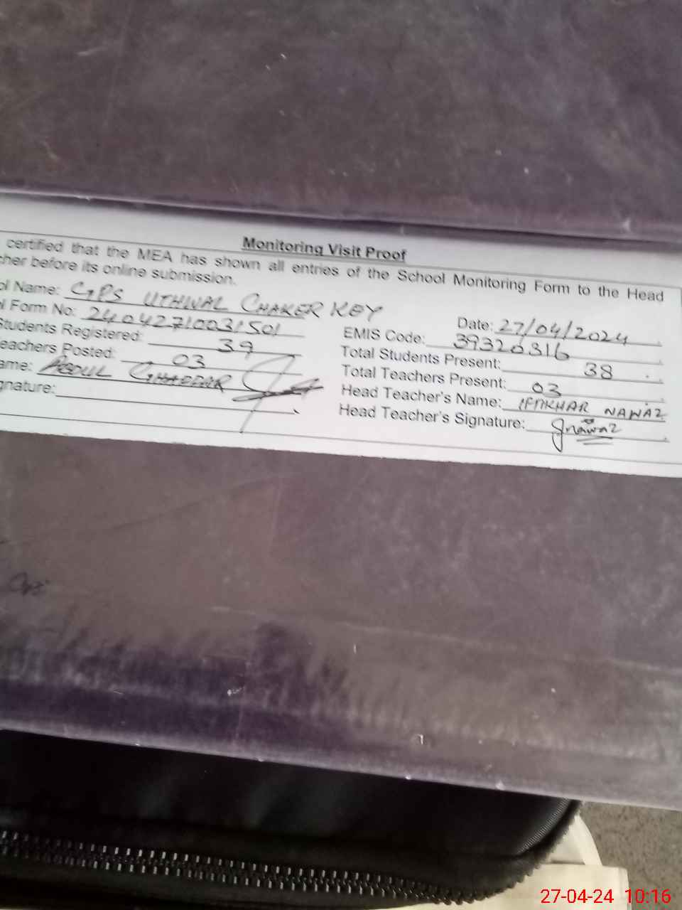 | Attendance Register | Head Teacher | MEA with School | Visit Proof |